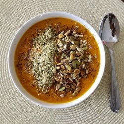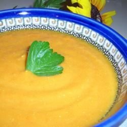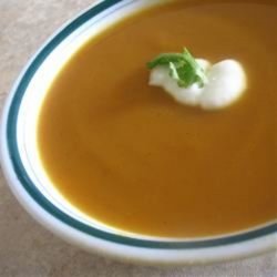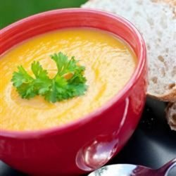 "A beautiful thick soup with bright orange colour and a hint of exotic spice. Perfect for autumn! Serve with a spoonful of plain yogurt and a sprig of fresh coriander for garnish."