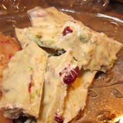 2In a separate microwave-safe bowl, microwave chocolate chips and candy coating together until melted and smooth, stirring occasionally. Stir in cherries and chopped pistachios, and spread into a wax paper-lined 15x10 inch pan. Chill for 1 hour, or until firm.