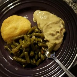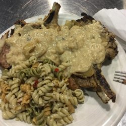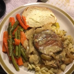 1Season pork chops with salt, pepper, and garlic powder, and then dredge in 1/2 cup flour. In a skillet over medium heat, lightly brown chops in a small amount of oil.